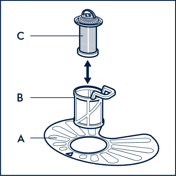 7. Okrogla filtra (B) in (C) namestite nazaj na ploski filter (A). Obračajte v smeri urinega kazalca, dokler se ne zaskoči.