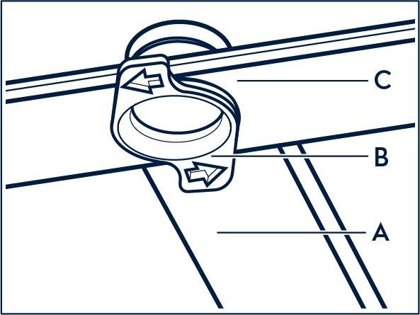 3. Če želite znova pritrditi pršilno ročico (C), vstavite montažni element (B) v pršilno ročico in jo pritrdite v dovodno cev (A), tako da jo obračate v smeri urinega kazalca. Prepričajte se, da se je montažni element zaskočil na mesto.