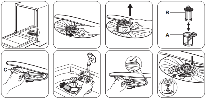 - Umazan filter upočasni pretok vode, kar ima za posledico nezadovoljive rezultate pomivanja posode.